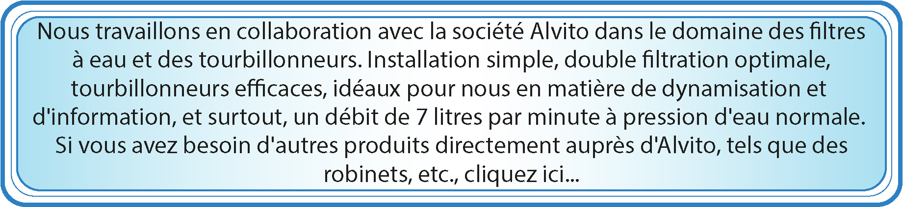 Le tourbillonneur haute vitesse pour robinet élève considérablement le niveau énergétique de votre eau. Il suffit de le visser sur le premier pour obtenir un double tourbillonnement.