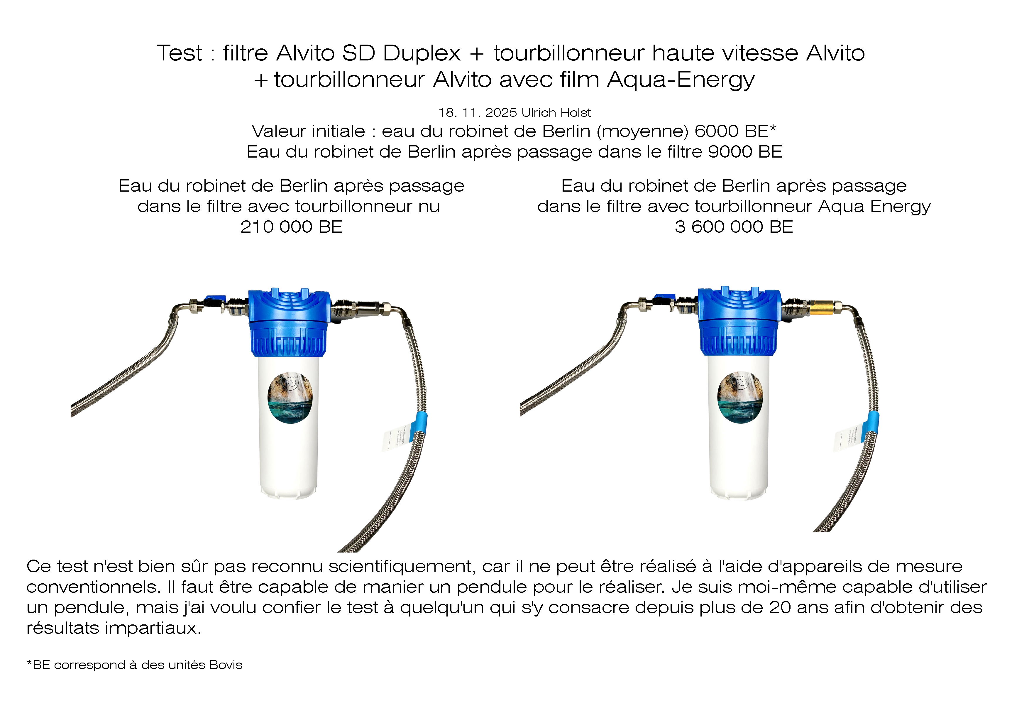 Nous avons réfléchi au fonctionnement de notre petit système de filtration complet et avons donc effectué un test de passage qui nous a permis de constater les différences entre les variantes. D'abord, l'eau du robinet de Berlin telle qu'elle sort du robinet dans chaque foyer. Ensuite, filtrée comme le propose Alvito, même s'il est clair que cela ne permet pas encore une énergisation élevée. Enfin, telle qu'Alvito la propose en complément avec un tourbillonnement à grande vitesse et notre variante avec l'information du film et l'énergisation par l'eau du haut plateau vénézuélien.