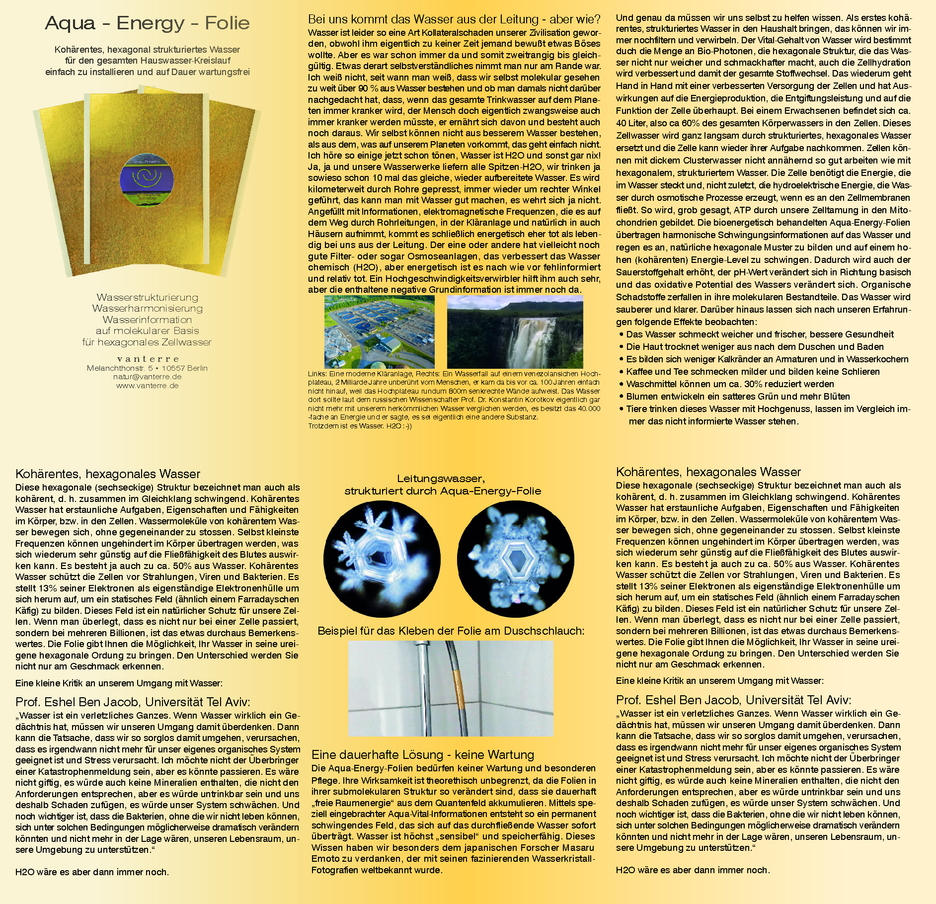 En precies daar moeten we onszelf helpen. Allereerst moeten we coherent, gestructureerd water in huis halen, dat kunnen we nog steeds filteren en wervelen. De vitale inhoud van water wordt bepaald door de hoeveelheid biofotonen, de hexagonale structuur, die het water niet alleen zachter en smakelijker maakt, maar ook de celhydratatie verbetert en daarmee de hele stofwisseling. Dat gaat weer hand in hand met een verbeterde toevoer naar de cellen en heeft invloed op de energieproductie, het ontgiftingsvermogen en de werking van de cel in het algemeen. Bij een volwassene bevindt zich ongeveer 40 liter, dus ongeveer 60% van het totale lichaamsvocht, in de cellen. Dit celvocht wordt heel langzaam vervangen door gestructureerd, hexagonaal water en de cel kan stukje bij beetje weer haar taken vervullen. Cellen kunnen met dik, groot clusterwater lang niet zo goed werken als met hexagonaal, gestructureerd water. De cel heeft de energie nodig die in het water zit en, niet in de laatste plaats, de hydro-elektrische energie die water door osmotische processen produceert wanneer het langs de celmembranen stroomt. Grofweg gezegd wordt ATP zo door onze celactiviteit in de mitochondriën gevormd. De bio-energetisch behandelde Aqua-Energy-folies brengen natuurlijke trillingsinformatie over op het water en stimuleren het om natuurlijke hexagonale patronen te vormen en op een hoog (coherent) energieniveau te trillen. Hierdoor wordt ook het zuurstofgehalte verhoogd, verandert de pH-waarde in de richting van basisch en verandert het oxidatiepotentieel van het water. Organische verontreinigingen vallen uiteen in hun moleculaire bestanddelen. Het water wordt schoner en helderder. Bovendien kunnen volgens onze ervaringen de volgende effecten worden waargenomen: